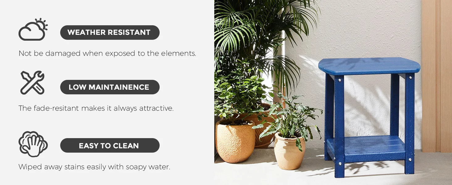 - [DURABLE MATERIAL]This side tables are made of recycled plastic HDPE material that is more weather resistant than other poly lumber table.HDPE is an eco-friendly solution to wood.Weatherproof, heavy-duty construction withstands a range of environmental stressors,Weatherproof, heavy-duty construction withstands a range of environmental stressors