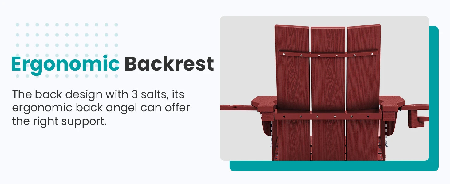 - Comfortable Backrest: Different from the normal Adirondack chairs which usually use 4 to 5 slats to build a backrest, our modern Adirondack chair is built with a 3 slats backrest, the extended width of slats can highly improve the sitting comfort.