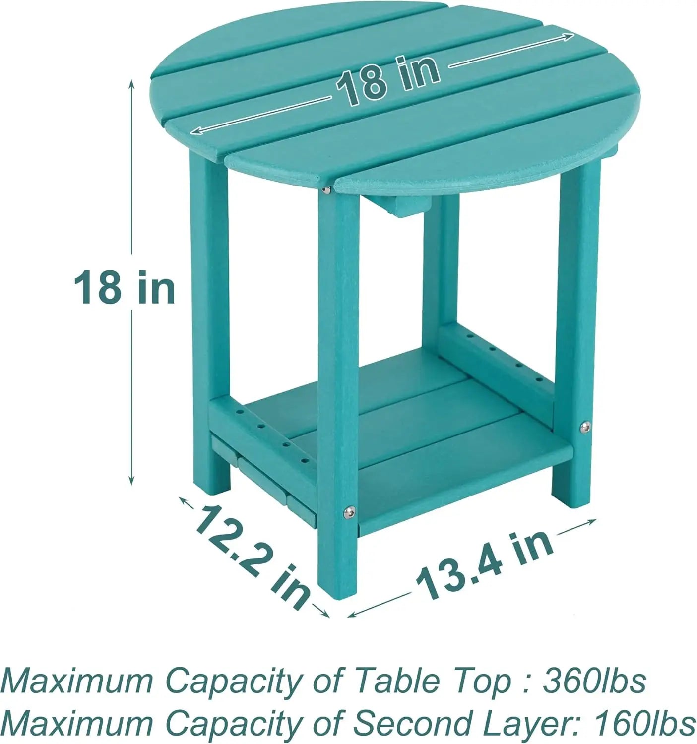 - [Dimension]:The diameter of the round table top is: Φ18, the second tier table top is: 13.4 (W) x 12.2 (D). Total height of table: 18″. The maximum capacity of the table top is 360 lbs, and the maximum capacity of the second layer is 160 lbs. There are crossbars under the tabletops to increase tabletop stability. The structure is designed to be more stable and have more weight capacity than other tables. Please measure the size, before purchase.